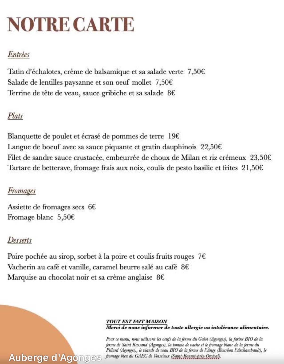Bonsoir, Nous avons donc contacté l'auberge d'Agonges qui peut nous recevoir pour le repas de l'assemblée générale le 29 mars au midi. Il faudrait bloquer la date assez rapidement. Ci-joint des exemplaires de menus type : ils sont renouvelés une à deux fois par semaine cela nous donne un ordre des tarifs. Merci de nous faire un retour assez rapidement si cela convient à tout le monde et également savoir combien nous sommes. Pour rappel il reste l'option des trois Topines. ![]() ![]() Bon ciel à tous avec cette météo dégagée en ce moment. |