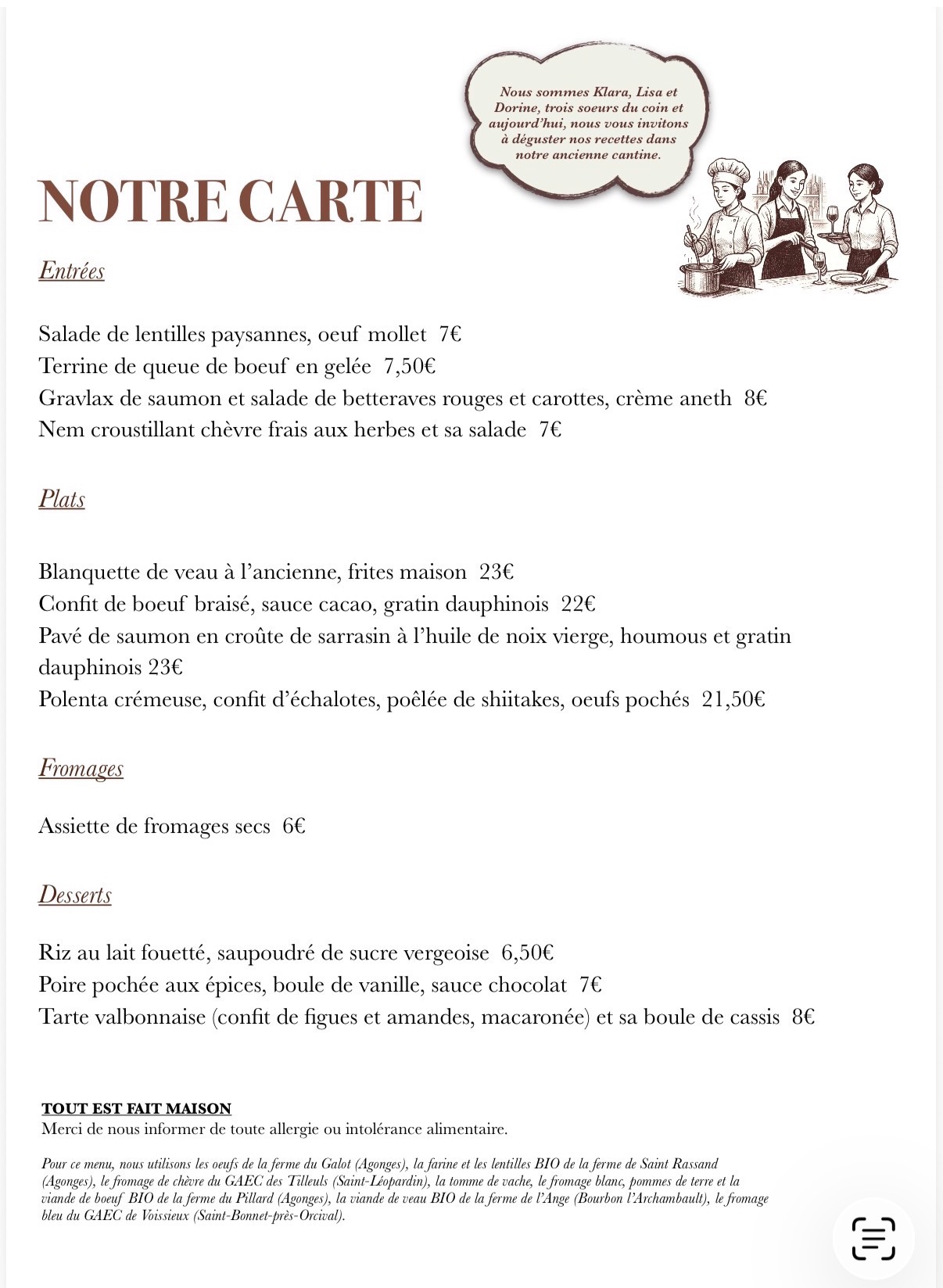 Bonsoir, Nous avons donc contacté l'auberge d'Agonges qui peut nous recevoir pour le repas de l'assemblée générale le 29 mars au midi. Il faudrait bloquer la date assez rapidement. Ci-joint des exemplaires de menus type : ils sont renouvelés une à deux fois par semaine cela nous donne un ordre des tarifs. Merci de nous faire un retour assez rapidement si cela convient à tout le monde et également savoir combien nous sommes. Pour rappel il reste l'option des trois Topines. ![]() ![]() Bon ciel à tous avec cette météo dégagée en ce moment. |